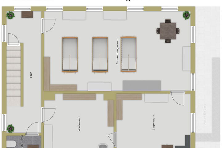 Das Haus verfügt über ca. 161 m² Nutzfläche, verteilt auf acht Räume. Ein Windfang mit Garderobe empfängt die Besucher, angrenzend befindet sich die Rezeption. Auf der Erdgeschossebene liegen zwei großzügige Räume, die derzeit als Behandlungsräume genutzt werden, sowie ein WC und ein geräumiger Flur mit einer weiteren Hauseingangstüre.