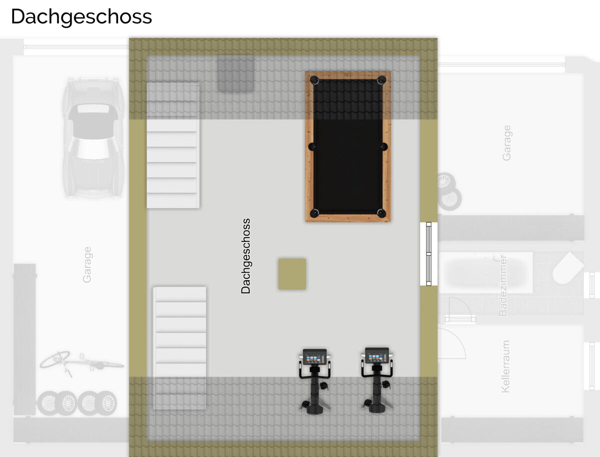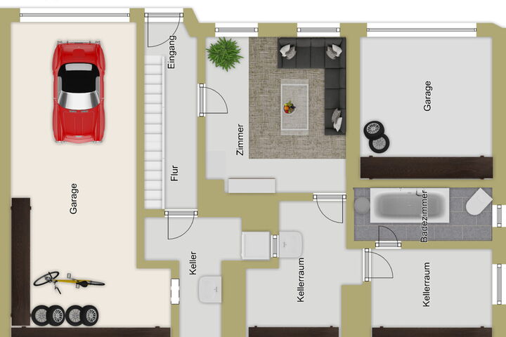 Die Wohnfläche von ca. 121 m² erstreckt sich über zwei Etagen und umfasst insgesamt fünf Zimmer. Der Hauseingang befindet sich im Hanggeschoss. Dort erwarten Sie ein flexibel nutzbares Zimmer, ein Badezimmer sowie drei Kellerräume, die viel Stauraum bieten. Vom Keller aus gelangen Sie direkt in die Garage. Eine weitere Garage ist ebenfalls vorhanden.