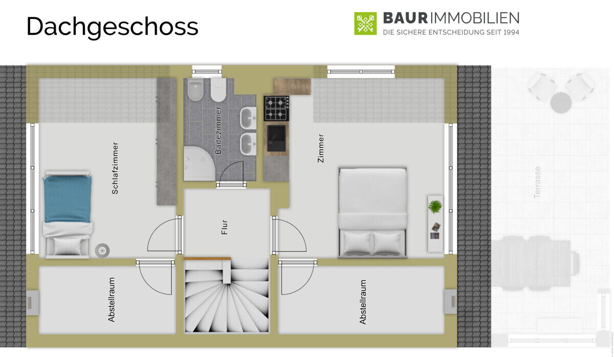 Das Dachgeschoss bietet weitere Nutzungsmöglichkeiten: Ein großes Zimmer mit integrierter Küche eignet sich ideal als Gäste-, Arbeits- oder Jugendbereich. Zudem stehen ein weiteres Schlafzimmer, sowie ein angrenzender Abstellraum zur Verfügung. Ein zusätzliches Badezimmer mit Dusche, zwei Waschbecken, WC und Bidet rundet diese Etage ab.
