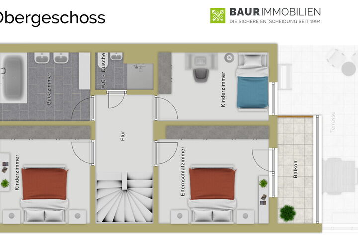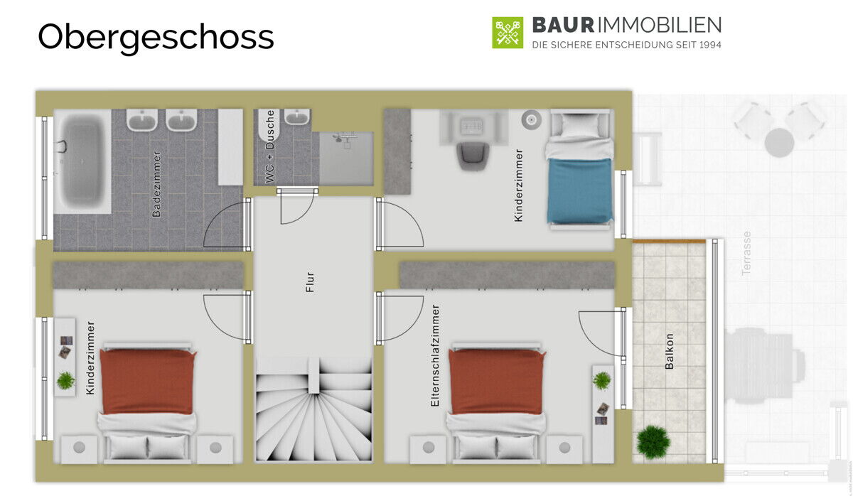 Im Obergeschoss befinden sich drei weitere Zimmer, darunter ein Elternschlafzimmer sowie zwei Kinderzimmer. Das Tageslichtbad ist mit zwei Waschbecken und einer Badewanne ausgestattet. Vom Elternschlafzimmer aus haben Sie Zugang zum Balkon. Ein separates WC mit Dusche sorgt für zusätzlichen Komfort.