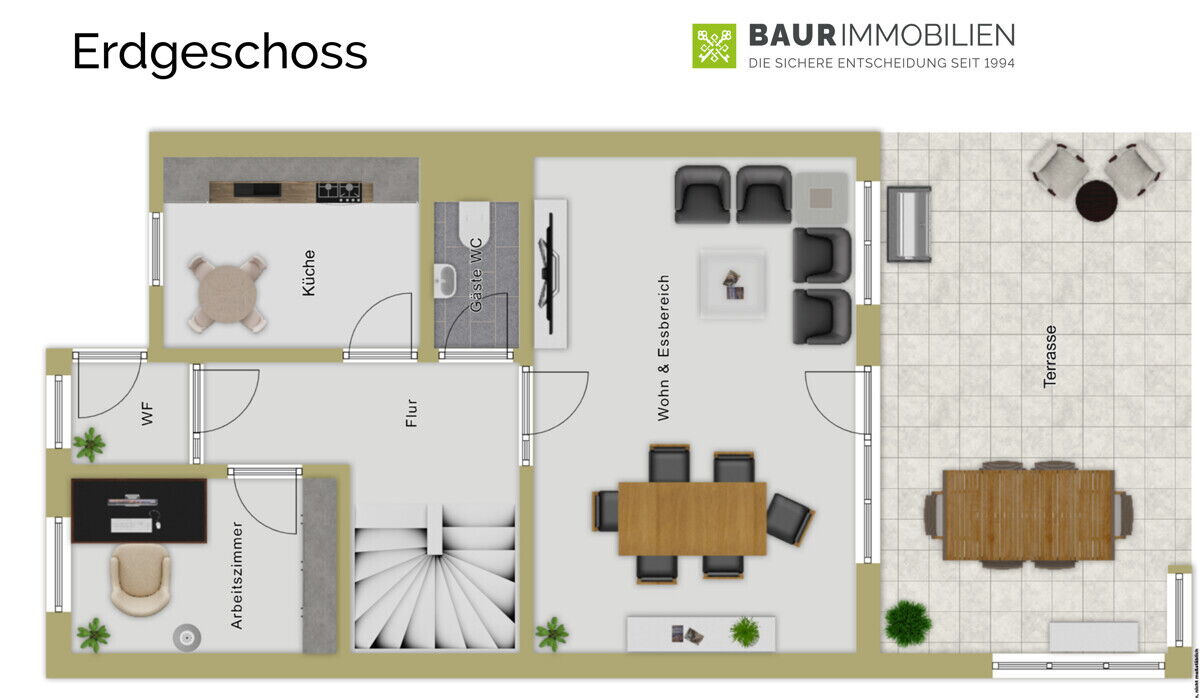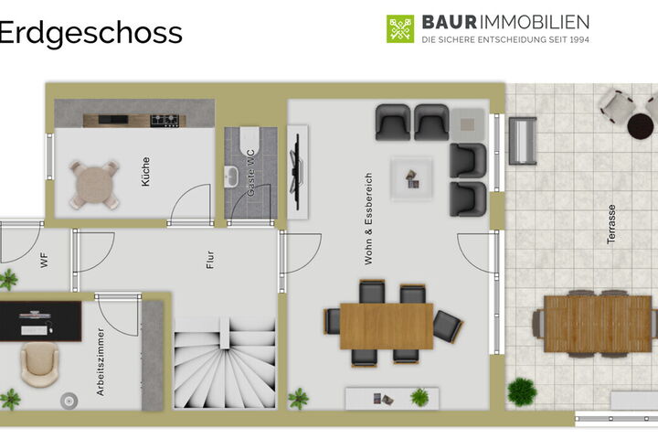 Im Erdgeschoss werden Sie über einen Windfang empfangen. Von hier aus gelangen Sie in den großzügigen Wohn- und Essbereich mit direktem Zugang zur Terrasse und in den Garten. Die angrenzende Küche ist mit einer Einbauküche ausgestattet. Ergänzt wird diese Etage durch ein Gäste-WC sowie ein weiteres Zimmer, das sich ideal als Arbeits- oder Gästezimmer nutzen lässt.