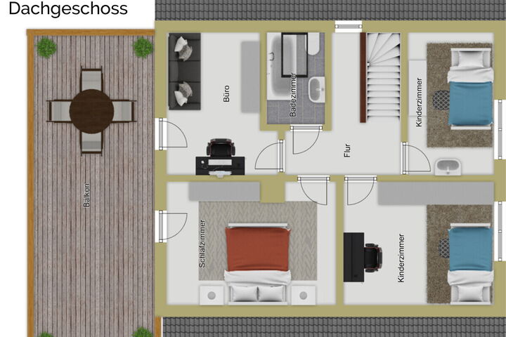 Das Erdgeschoss bildet den zentralen Wohnbereich des Hauses. Hier befinden sich das Wohnzimmer sowie ein separates Esszimmer, die gemeinsam viel Platz für den Alltag und gesellige Stunden bieten. Die Räume sind gut geschnitten und lassen sich vielseitig nutzen.