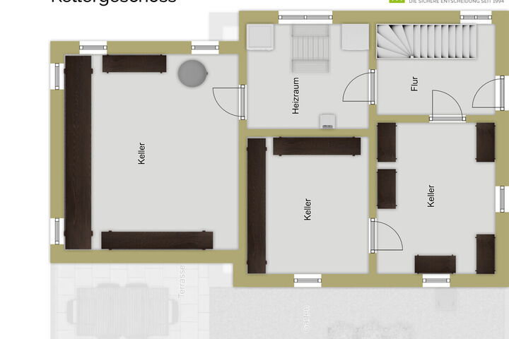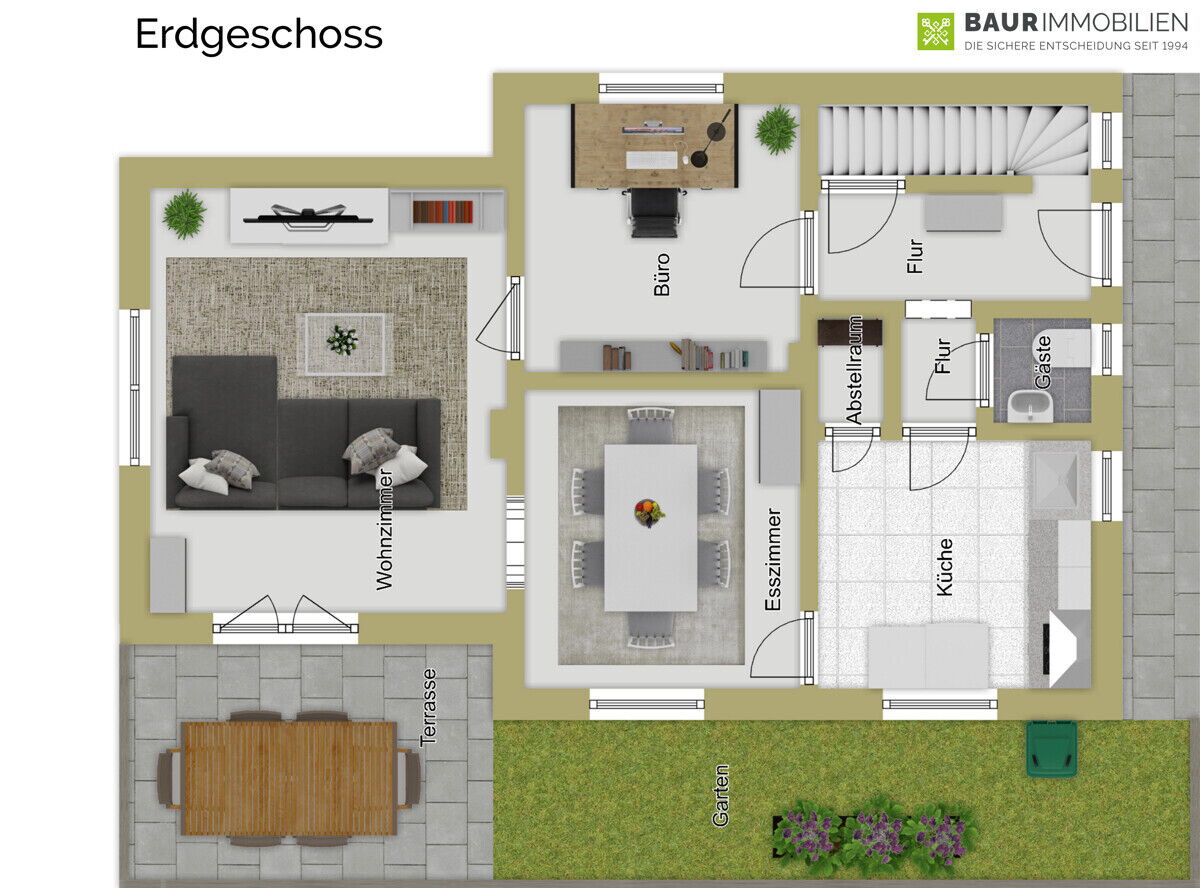 Im Erdgeschoss befindet sich das großzügige Wohnzimmer, sowie das Esszimmer und die Küche. Im Dachgeschoss befinden sich weitere Zimmer, welche flexibel als Schlaf-, Arbeits-, oder Kinderzimmer genutzt werden können.