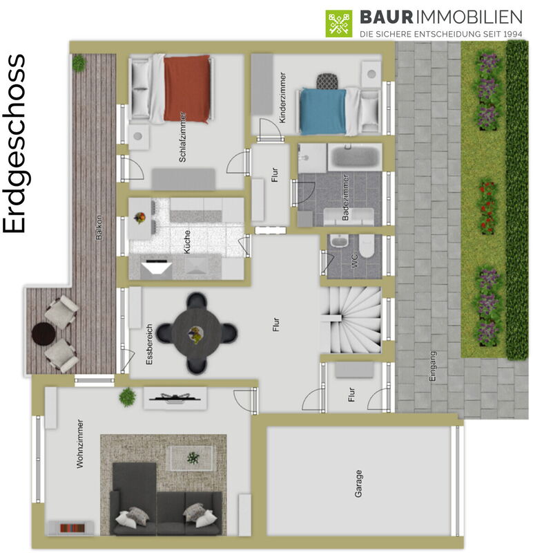 Ein Südbalkon im Erdgeschoss, der sonnige Garten sowie eine Garage mit elektrischem Torantrieb ergänzen das Gesamtangebot.