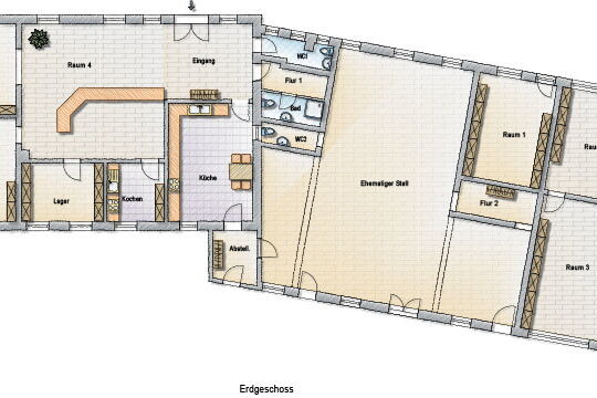 Im Wirtschaftsteil des Gebäudes befinden sich ein ehemaliger Stall sowie diverse Lagerflächen.