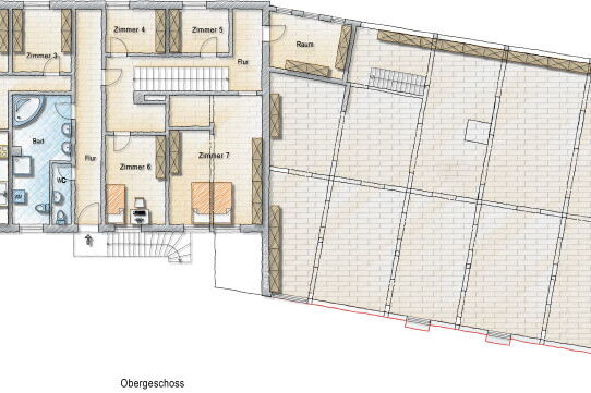 Im Obergeschoss finden Sie Wohnräume, welche ursprünglich als Betriebsleiterwohnung genutzt wurden und im Moment vermietet sind. Auf Wunsch können diese auch zur Eigennutzung übernommen werden.