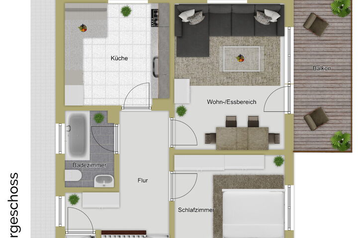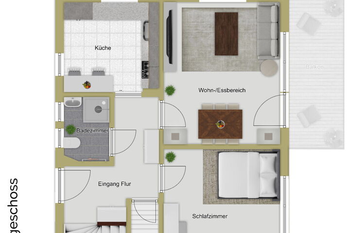 Beim Betreten werden Sie vom Eingangsbereich mit Garderobe empfangen. Auf dieser Etage finden Sie einen großzügigen Wohn-/ und Essbereich, ein Schlafzimmer, eine Küche sowie ein Badezimmer mit barrierefreier Dusche, Waschbecken und WC. Vom Essbereich aus gelangen Sie auf die sonnige Süd-Terrasse und in den gepflegten Garten – ein idealer Ort für entspannte Stunden mit Familie und Freunden, für Grillabende oder zum Ausruhen auf der Sonnenliege. Ein praktischer Geräteschuppen ergänzt den Außenbereich.