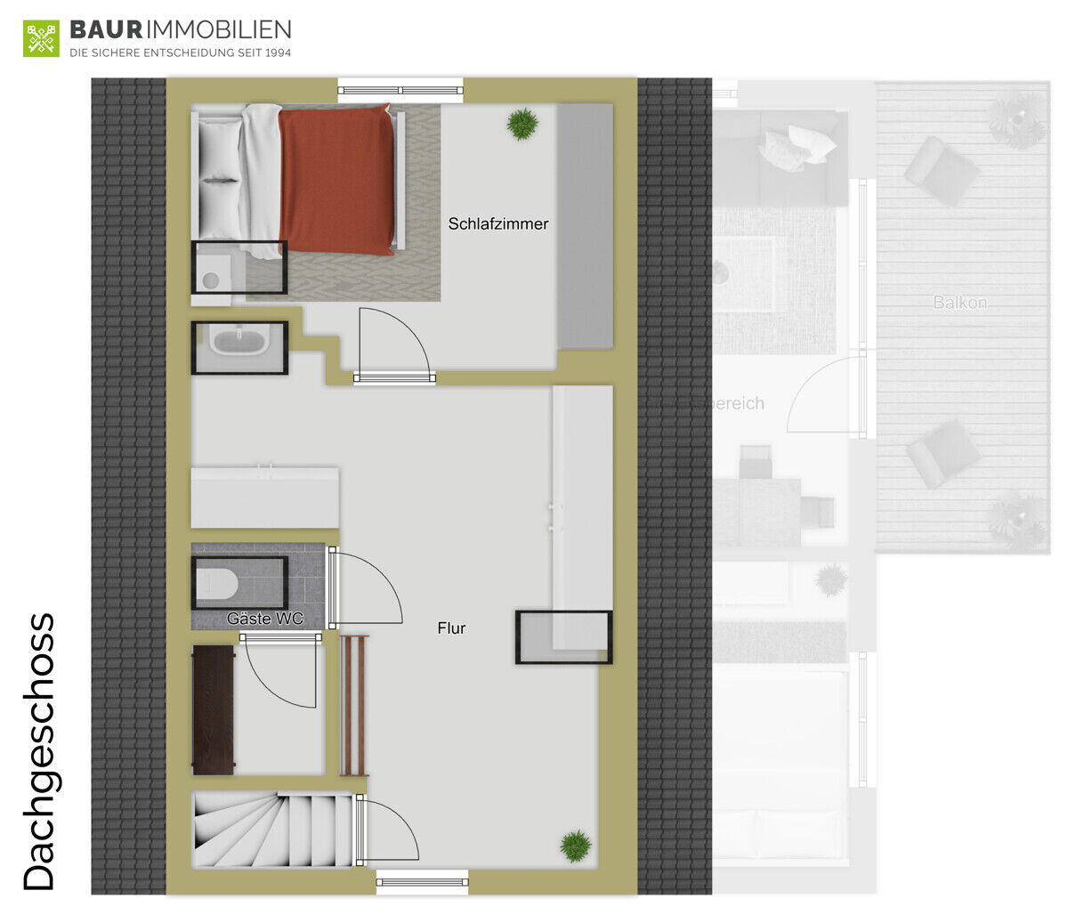 Das Dachgeschoss wurde in Eigenleistung vom Verkäufer zu wohndienlichen Zwecken ausgebaut. Eine baurechtliche Prüfung durch den Verkäufer oder BaurImmobilien GmbH hat nicht stattgefunden.