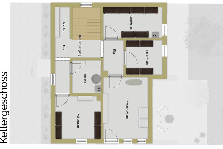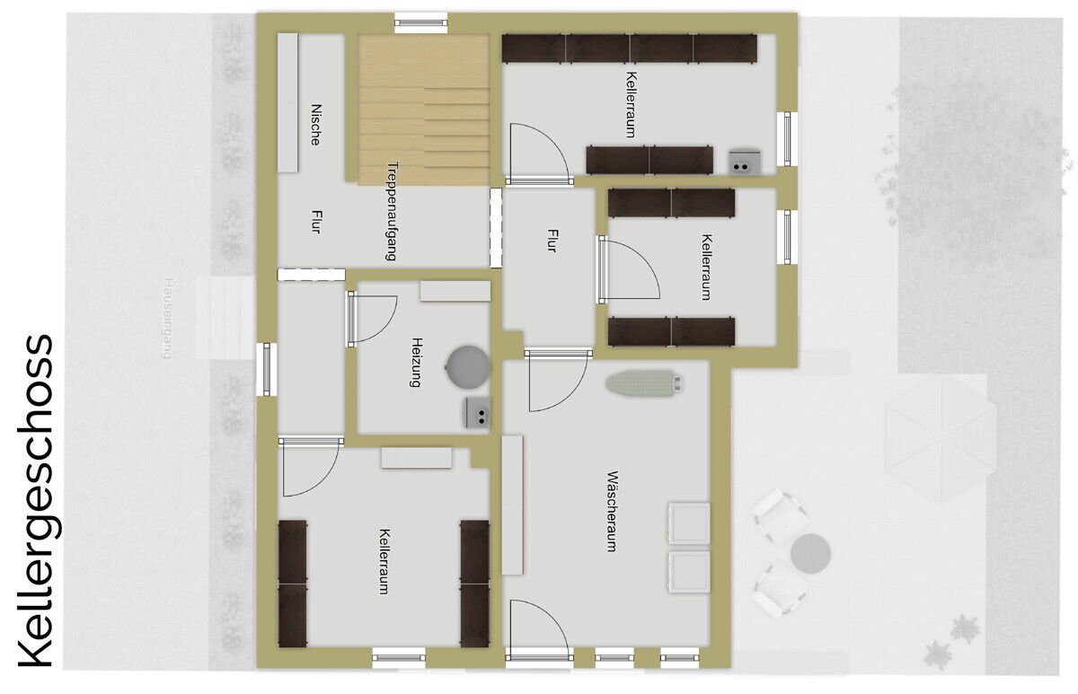 • Kellergeschoss: Voll unterkellert mit viel Stauraum, der Gas-Zentralheizung und einer Entkalkungsanlage für weiches Wasser.
