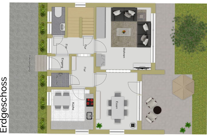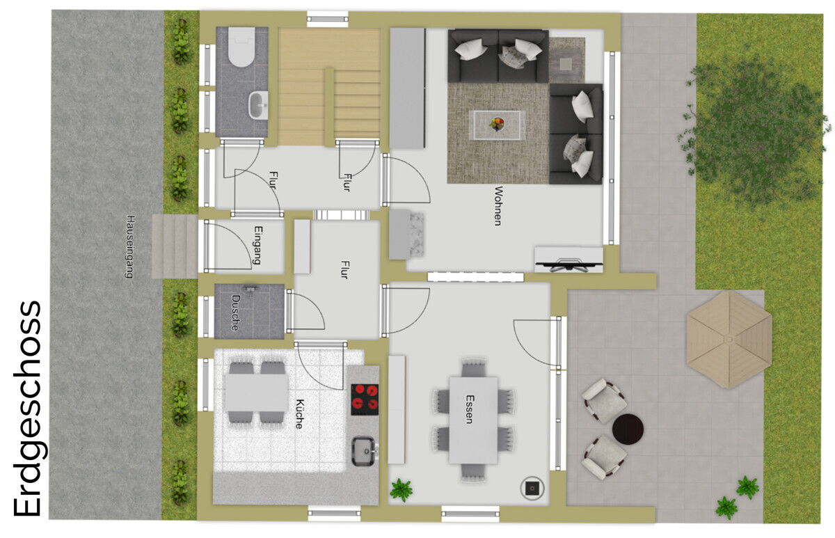 • Erdgeschoss: Großzügiges Wohn-Esszimmer mit Zugang zur Terrasse und in den Garten, separate Küche, Duschbad sowie ein separates WC.