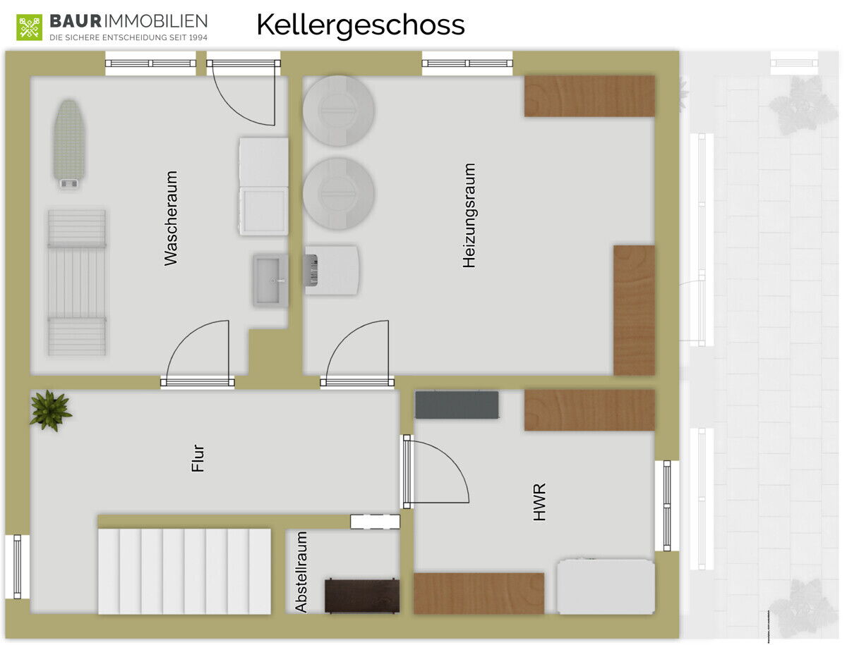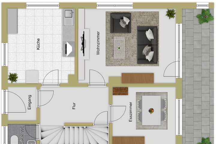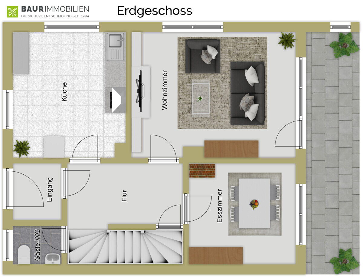 Im Erdgeschoss befinden sich ein Windfang, die Küche, ein Gäste-WC, sowie das helle Wohn- und Esszimmer mit schönem, originalem Parkettboden. Vom Wohnzimmer aus gelangen Sie auf die Terrasse und in den großzügigen Gartenbereich.