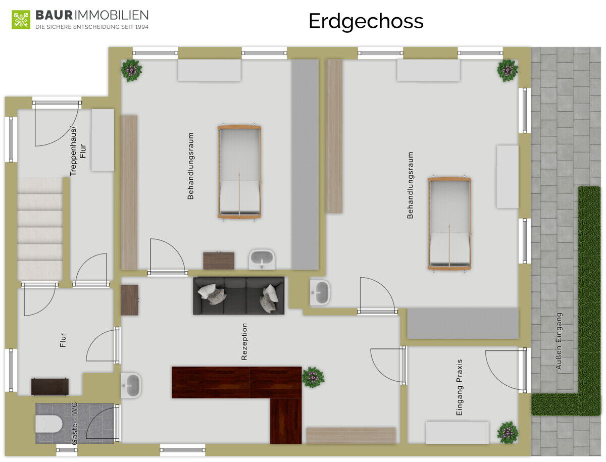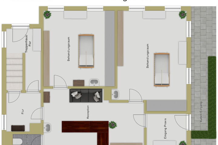 Ein Windfang mit Garderobe empfängt Besucher, angrenzend befindet sich die Rezeption. Auf der Erdgeschossebene liegen zwei großzügige Räume, die aktuell als Behandlungsräume genutzt werden, sowie ein WC und ein geräumiger Flur mit einer zusätzlichen Hauseingangstüre.
