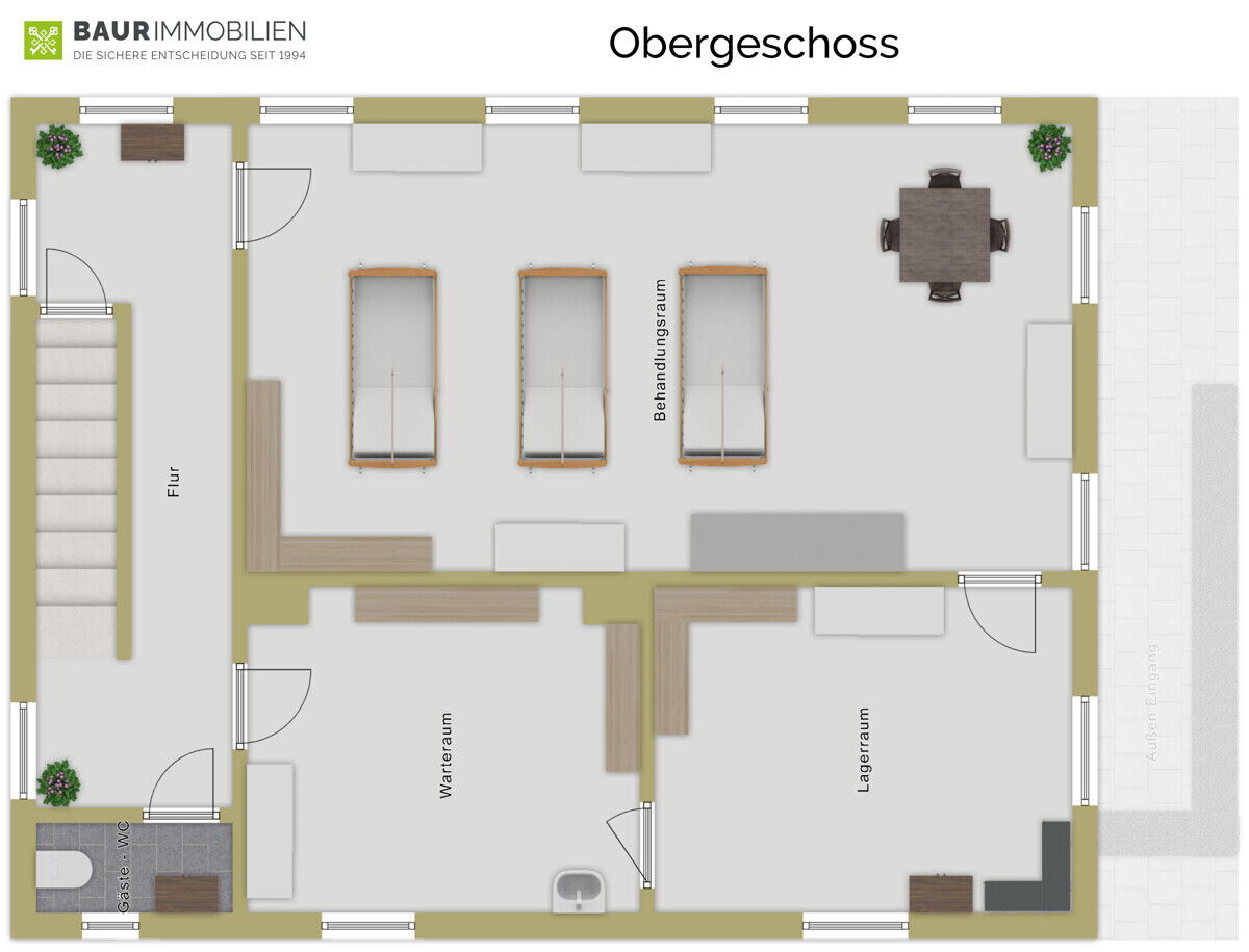 Im Obergeschoss stehen drei weitere Räume zur Verfügung – derzeit genutzt als großer Behandlungsraum, Lagerraum und Warteraum – ergänzt durch ein Gäste-WC.