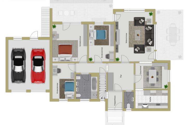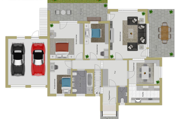Im Erdgeschoss erwartet Sie ein heller und weitläufiger Wohn- und Essbereich mit direktem Zugang zum Garten. Eine separate Küche, drei gut geschnittene Zimmer, ein Badezimmer sowie ein separates Gäste-WC bieten reichlich Platz und Komfort für den Familienalltag.