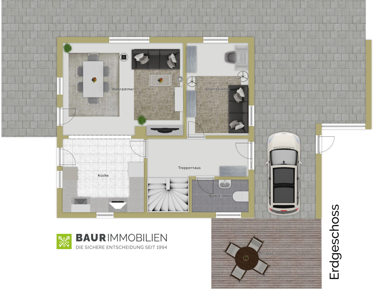 Im Erdgeschoss empfängt Sie ein großzügiger Eingangsbereich mit Platz für eine Garderobe. Von hier aus gelangen Sie in den offen gestalteten Wohn- und Essbereich mit integrierter Küche, der durch seine Großzügigkeit und Helligkeit den zentralen Lebensmittelpunkt des Hauses bildet. Von hier aus haben Sie direkten Zugang zur Terrasse und in den Garten. Ergänzend stehen auf dieser Ebene ein Büro, sowie ein Gäste-WC zur Verfügung. Das Dachgeschoss beherbergt drei gut geschnittene Schlafräume, sowie ein Bad und bietet damit ideale Voraussetzungen für das Familienleben. Zusätzlicher Stauraum ist sowohl im Dachspitz als auch im Keller vorhanden und sorgt für ausreichend Platz für Vorräte, Hobbys und saisonale Gegenstände.