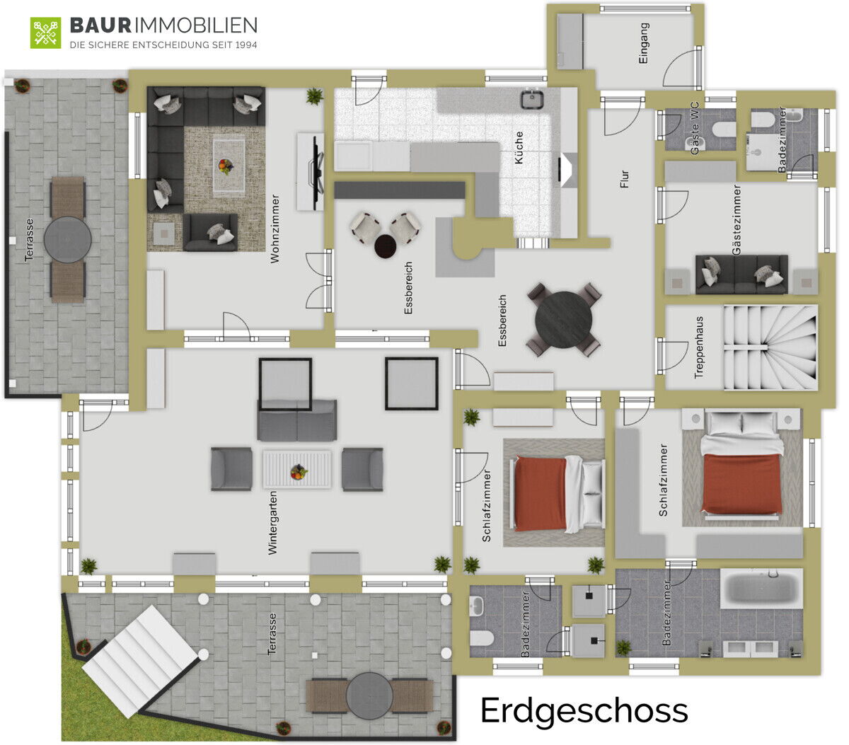 Das Erdgeschoss bildet das Herzstück des Hauses: Drei Schlafzimmer, jeweils mit eigenem Badezimmer, bieten hohen Komfort und Privatsphäre. Ergänzt wird diese Ebene durch ein separates Gäste-WC, eine große Küche mit direktem Zugang zur Terrasse, einen Essbereich mit gemütlichem Kachelofen sowie ein lichtdurchflutetes Wohnzimmer. Ein großzügiger Wintergarten verbindet den Innenraum harmonisch mit gleich zwei Terrassen.