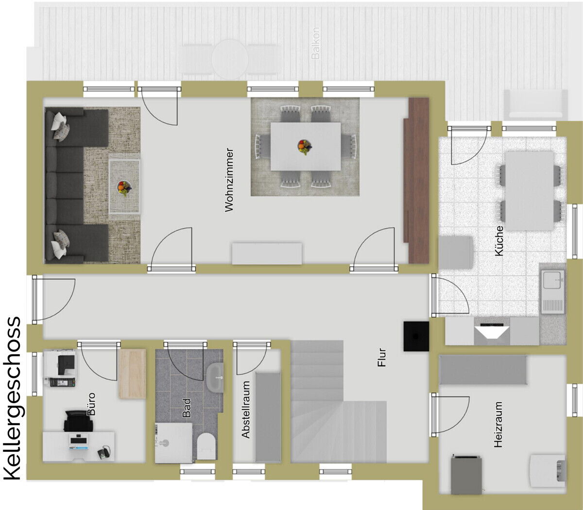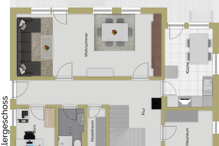 Im Untergeschoss befindet sich das Esszimmer und die Küche, welche zum entspannten Kochen einlädt. Von hier aus haben Sie Zugang zur Terrasse und in den Garten. Das große Wohnzimmer lädt zum gemeinsamen Entspannen ein und bietet auch direkten Zugang zum Garten. Im Untergeschoss befindet sich außerdem ein praktischer Abstellraum sowie das Badezimmer. Das nicht ausgebaute Dachgeschoss eröffnet vielfältige Möglichkeiten zur individuellen Gestaltung.