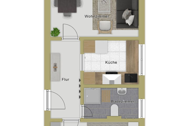 Die Küche ist als separater Raum gestaltet und bietet praktische Arbeitsflächen, sowie eine klare Trennung zum Wohnbereich. Das helle Tageslichtbad verfügt über Dusche, WC, Waschbecken und einen integrierten Waschmaschinenanschluss.
