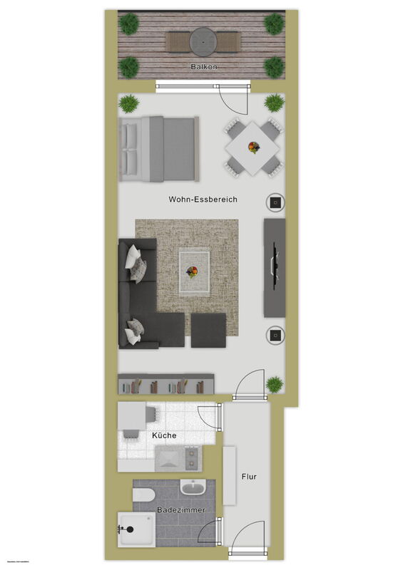 Beim Betreten empfängt Sie der Dielenbereich, von dem aus Sie in die Küche mit Einbauküche, das Bad mit Dusche, Waschbecken und WC, sowie in den großzügigen Wohn-, Ess- und Schlafbereich gelangen. Der Balkon ist Richtung Süden ausgerichtet. Vom Balkon aus kann man die Veitsburg sehen – und bei passendem Wetter auch die Alpen.