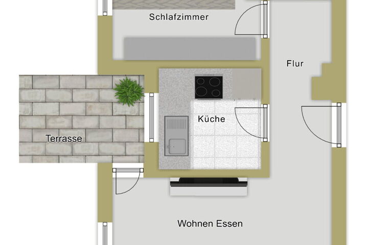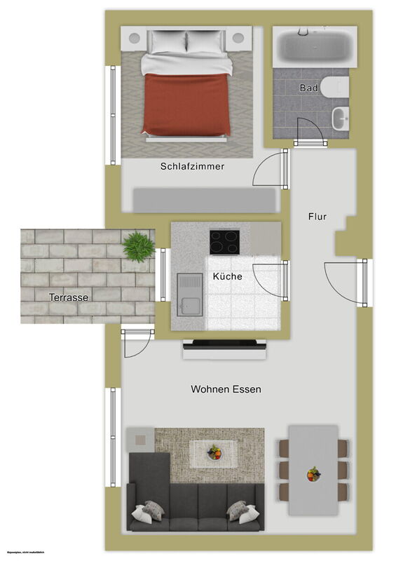 Die Aufteilung ist sehr attraktiv: Ein großzügiges Wohn- und Esszimmer bildet das Herzstück der Wohnung. Die separate Küche (Eigentum der Mieterin) bietet eine angenehme Abtrennung vom Wohnbereich. Das Badezimmer ist ausgestattet mit Badewanne, WC und Waschbecken. Besonders hervorzuheben ist die sehr großzügige Terrasse mit kleinem Gartenanteil – ein echter Mehrwert und bei Mietern äußerst gefragt. Ein eigener Pkw-Stellplatz gehört ebenfalls zur Einheit und steigert den Wohnkomfort zusätzlich.