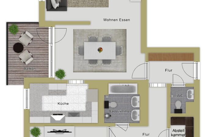 Herzstück der Wohnung ist der weitläufige Wohn- und Essbereich mit Zugang zum Balkon. Von hier aus gelangen Sie direkt in den privaten Garten mit zusätzlicher Terrasse und Gartenhaus – ein seltener Mehrwert, der urbanes Wohnen mit hohem Freizeitkomfort verbindet. Die separate Küche bietet ausreichend Platz für eine funktionale Gestaltung.