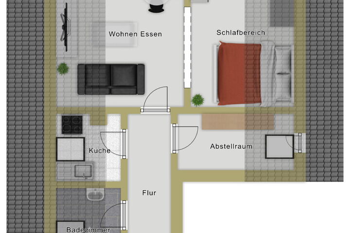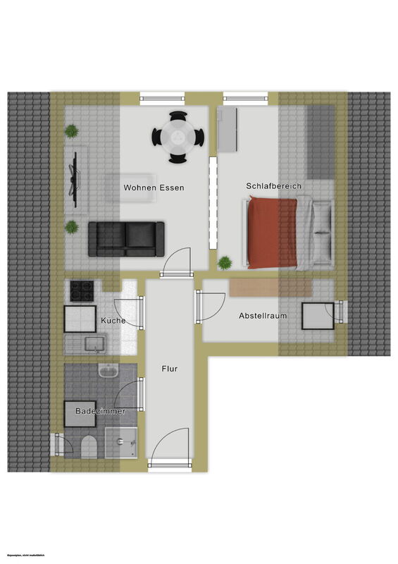 Die Raumaufteilung ist funktional und gut nutzbar. Der großzügig geschnittene Wohn- und Schlafbereich bildet den zentralen Raum der Wohnung und bietet ausreichend Platz für Wohnen, Schlafen und Arbeiten. Durch die Dachgeschosslage entsteht eine gemütliche Wohnatmosphäre. Die separate Küche ist kompakt gestaltet und bietet die Möglichkeit, diese im Zuge einer Modernisierung individuell neu zu planen und auszustatten.